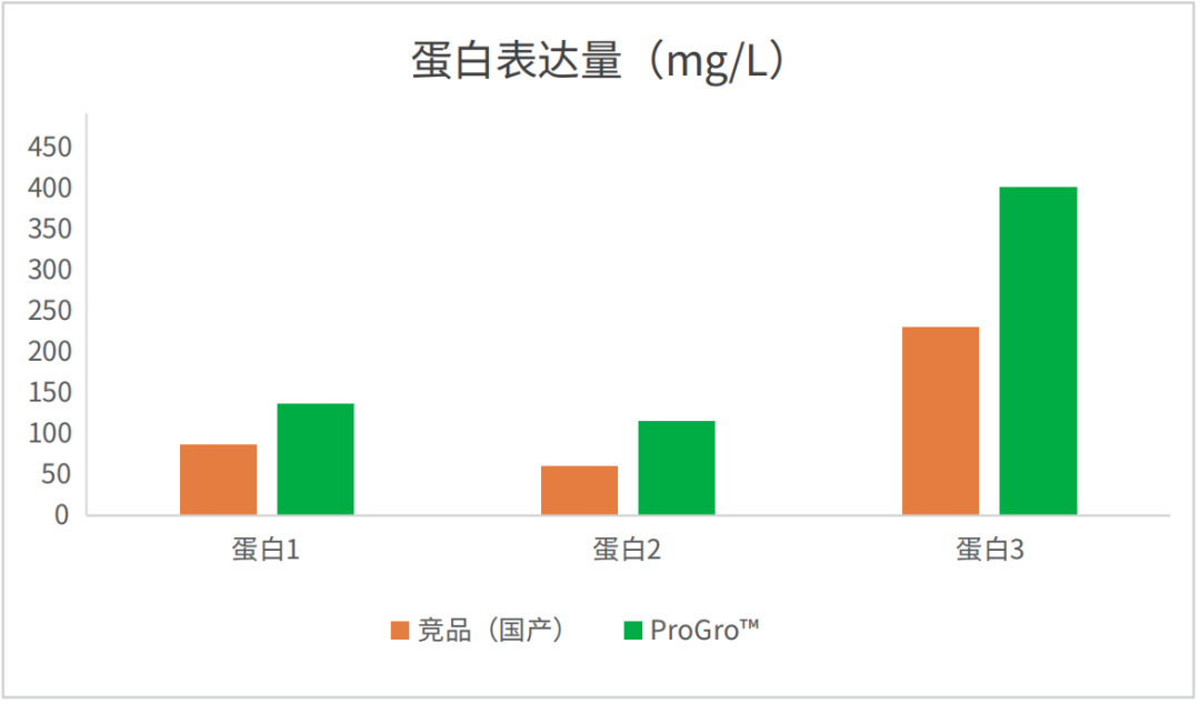 在ProGro™ 293 SFM和競品培養(yǎng)基中分別培養(yǎng)293細胞,分別轉(zhuǎn)染三種不同的蛋白質(zhì)粒,表達后第六天進行收樣,ELISA檢測蛋白表達量。在ProGro™ 293 SFM的表達系統(tǒng)中,三種蛋白的表達量均比競品培養(yǎng)基高出三分之一或以上。