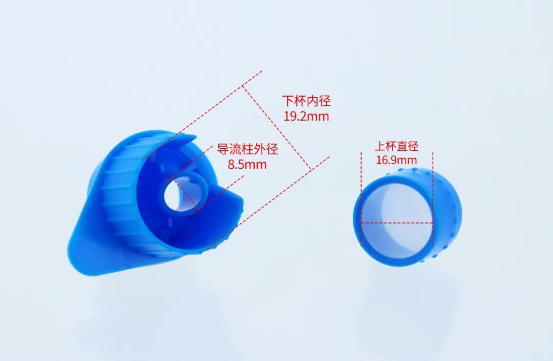 上下杯分體式設(shè)計,濾網(wǎng)直徑16.9mm,下杯內(nèi)徑19.2mm,導(dǎo)流柱外徑8.5mm,適配最小內(nèi)徑大于9mm、最大外徑小于19mm的管/瓶口徑的1.5mL-15mL離心管、流式管、培養(yǎng)管等