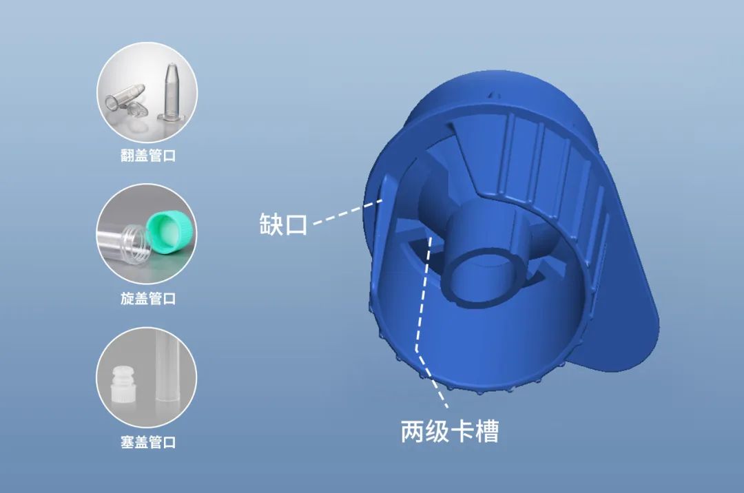 下杯缺口及兩級卡槽設(shè)計,可穩(wěn)固適配旋蓋、翻蓋和塞蓋等多種管/瓶口